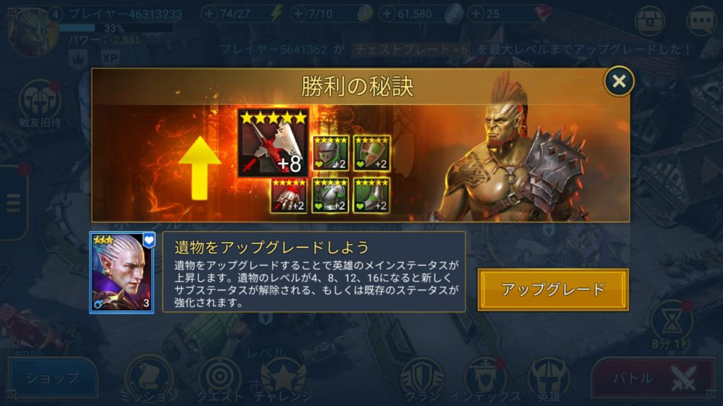 また、アリーナの報酬やクランボスの報酬では、よりレアリティの高い遺物を手に入れることが出来ます。
