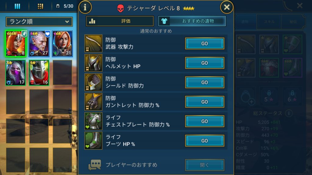 確認の仕方ですが、英雄をタップし確認したいキャラクターの評価を押すと、おすすめの遺物の装備を確認することが出来ます。