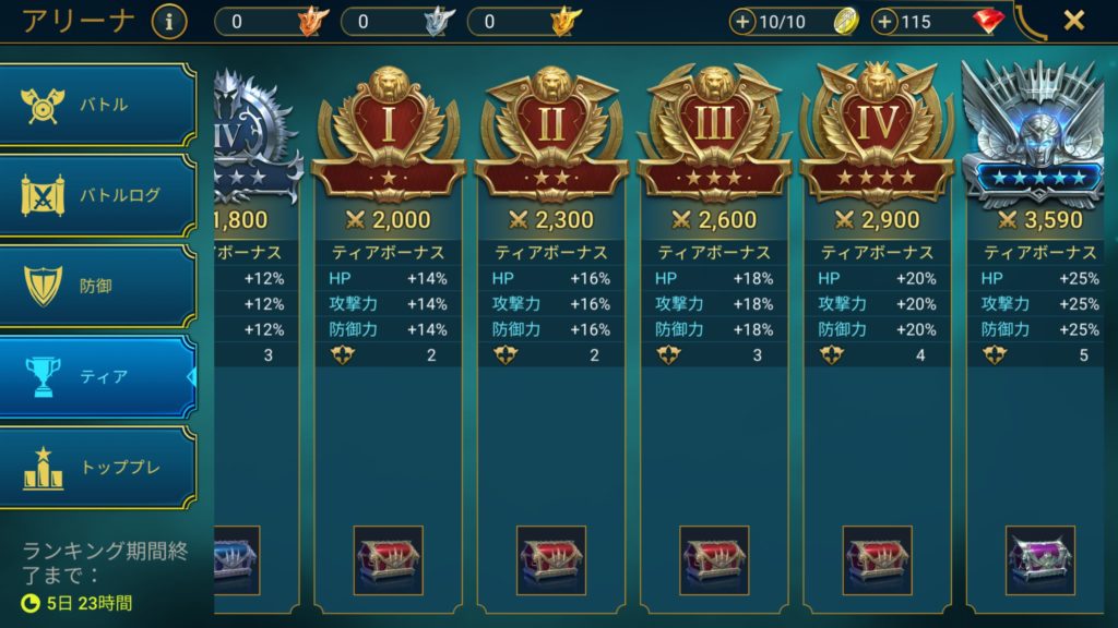 アリーナ戦は毎週報酬があり、上の階級に行くほど報酬が豪華になります。