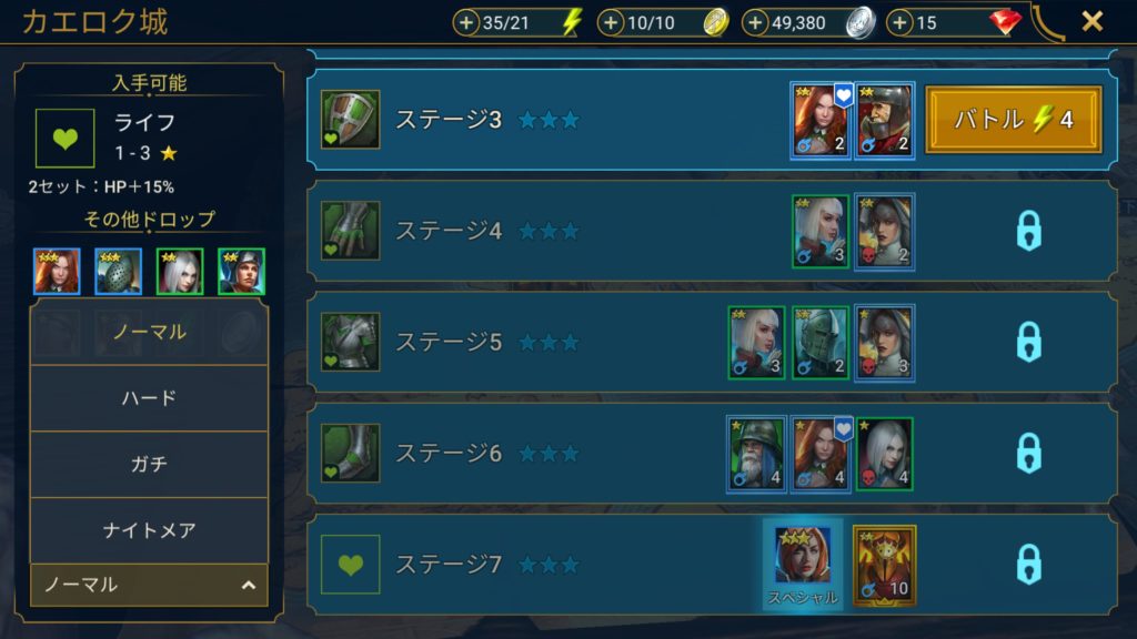 また、★を3つ獲得すると、「ハード」→「ガチ」→「ナイトメア」と次の難易度に挑戦することができ、さらに多くの経験値を得ていきましょう。