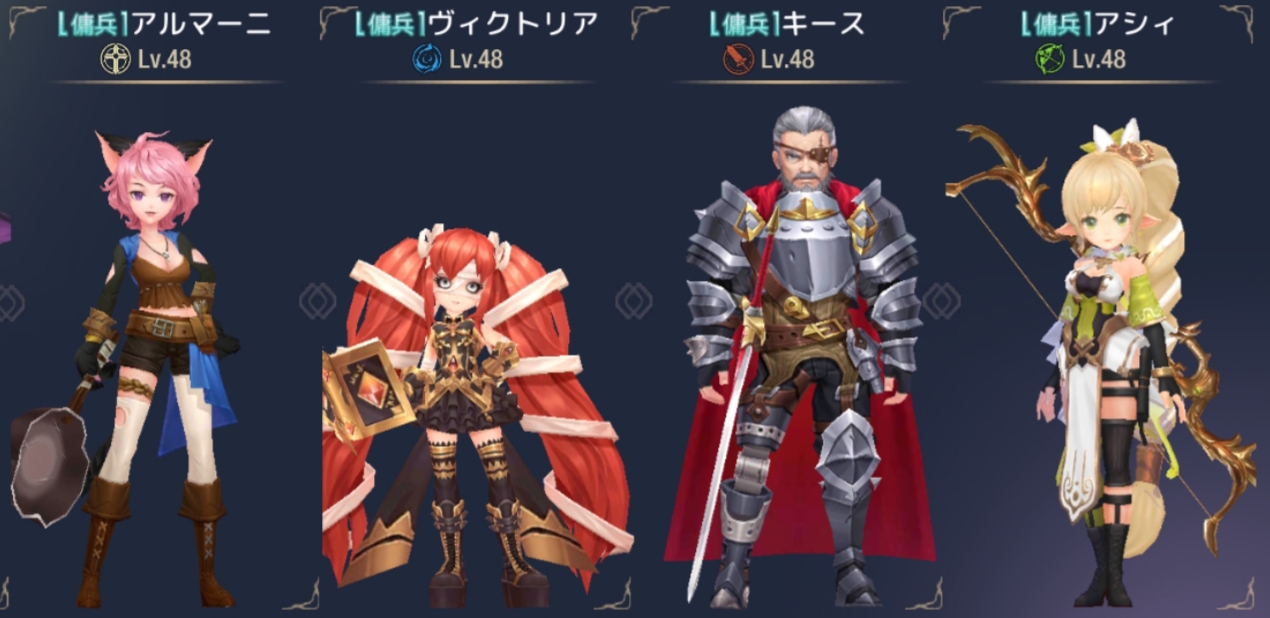 あまり難しく考えずに色々と組み合わせを試してみながら自分自身が今持っている「傭兵」達のステータスをフルに活躍出来るようにしていくのがベストですね。