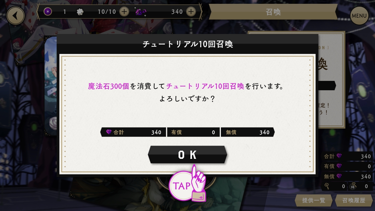 最初に選んだキャラクターのSRが一枚、さらにチュートリアル引き直し可能な10連ガチャが引け、そこでSSRが一枚、SR が二枚確定で排出されるので、序盤から気になるキャラクターと戦力がある程度そろった状態でゲームを進めることができます。