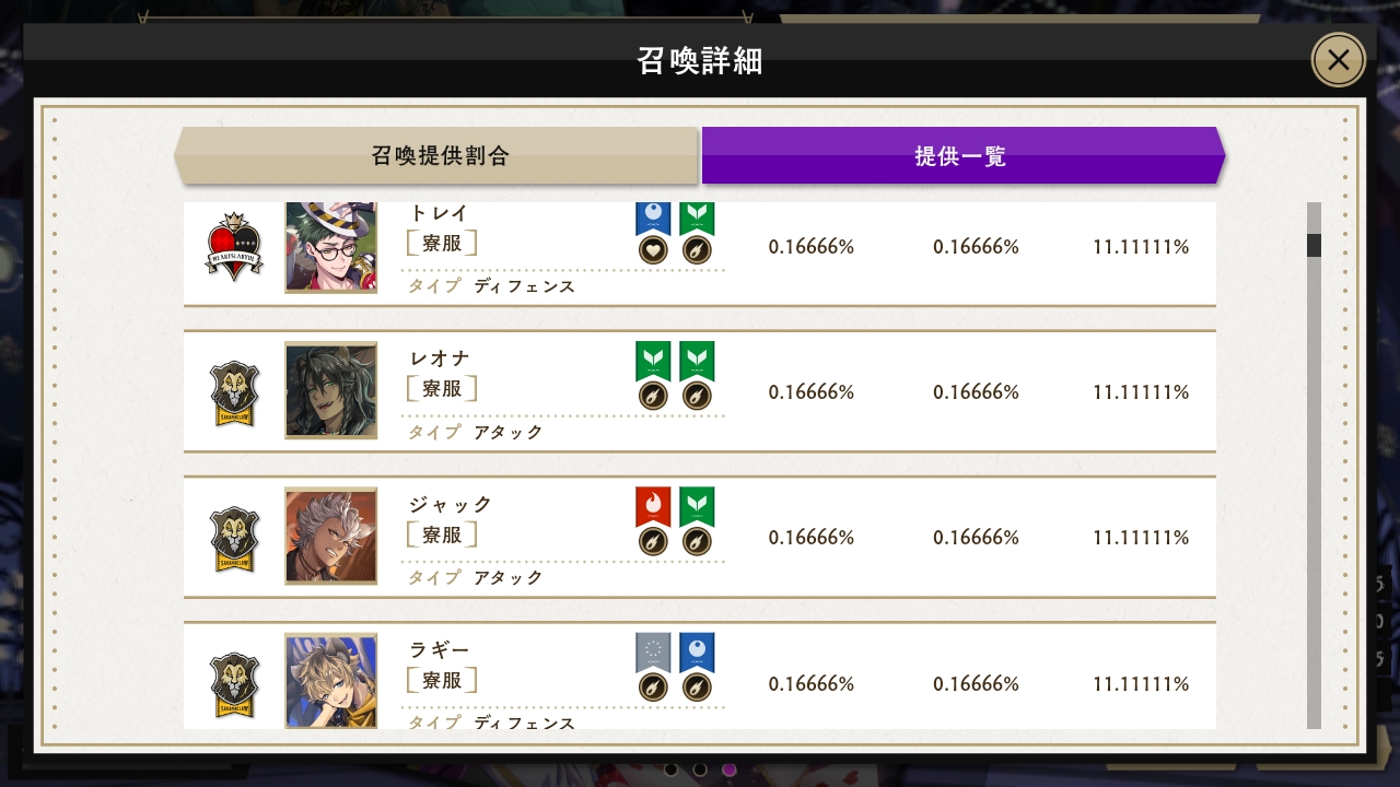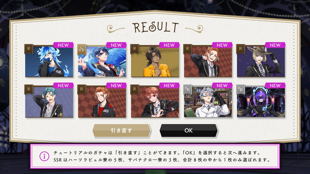 しかし、SSRカードに関してはまだ枚数が少なく、現在引き直し可能10連ガチャでは、ハーツラピュル寮の5人(リドル・エース・デュース・トレイ・ケイト)とサバナクロー寮の3人(レオナ・ジャック・ラギー)しか排出されません。