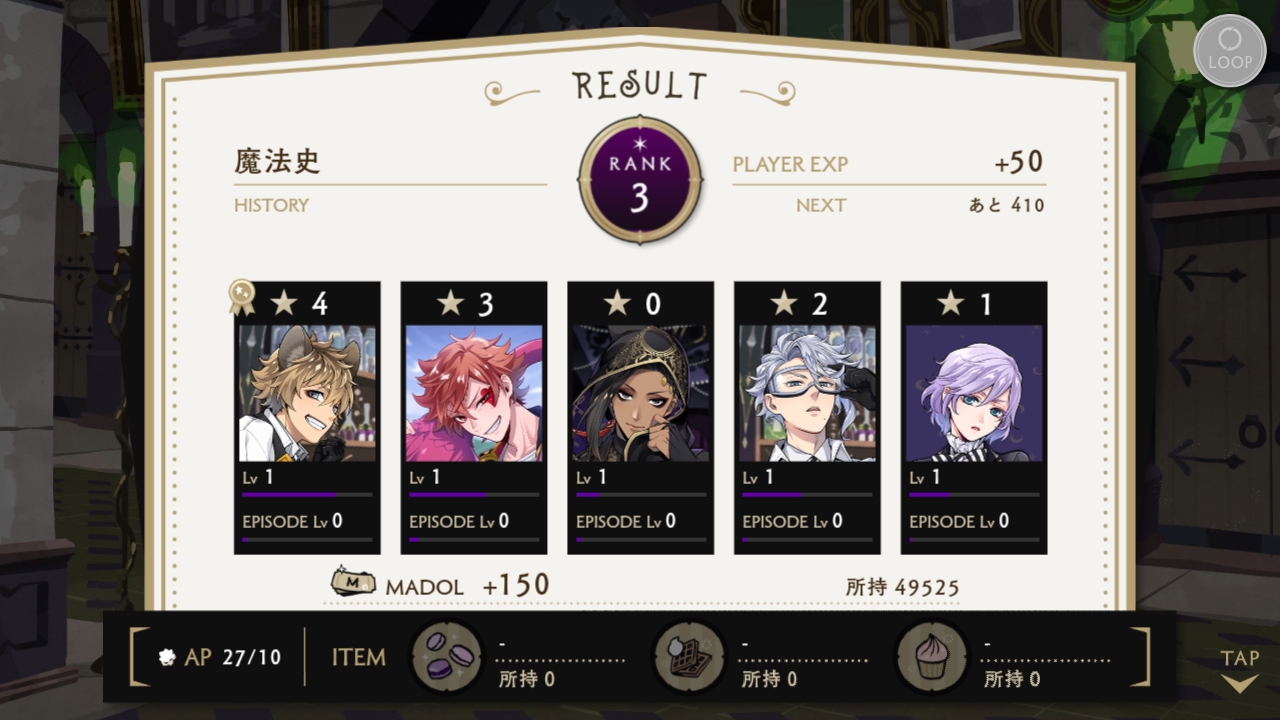 エピソードレベルもカードレベルと同様に、ストーリーで戦闘に勝利したり、授業を受けることによって少しずつ経験値が得られます。