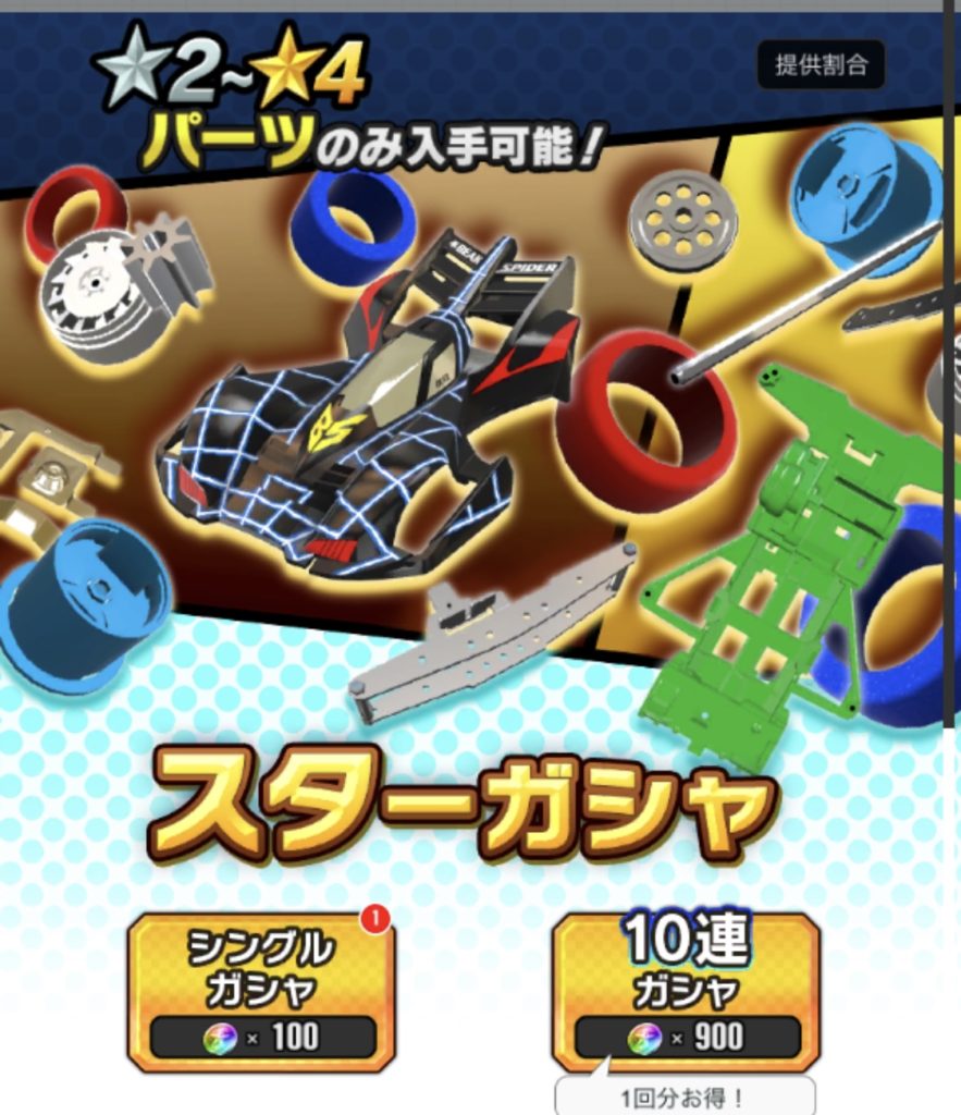 スターガシャはスターコインで★2~★4のパーツのみ入手可能です。