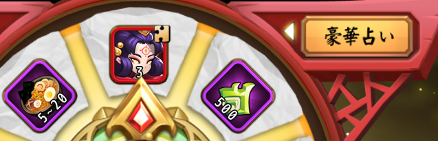 豪華占いだと相当の小判が必要になりますが、赤式神を手に入れてどうしても戦力をアップを狙いたい場合は、ルーレットで欠片を集めるのもいいかとは思います。