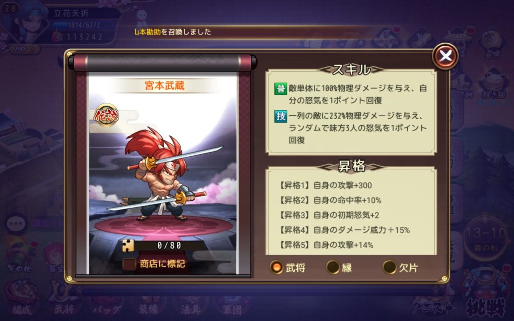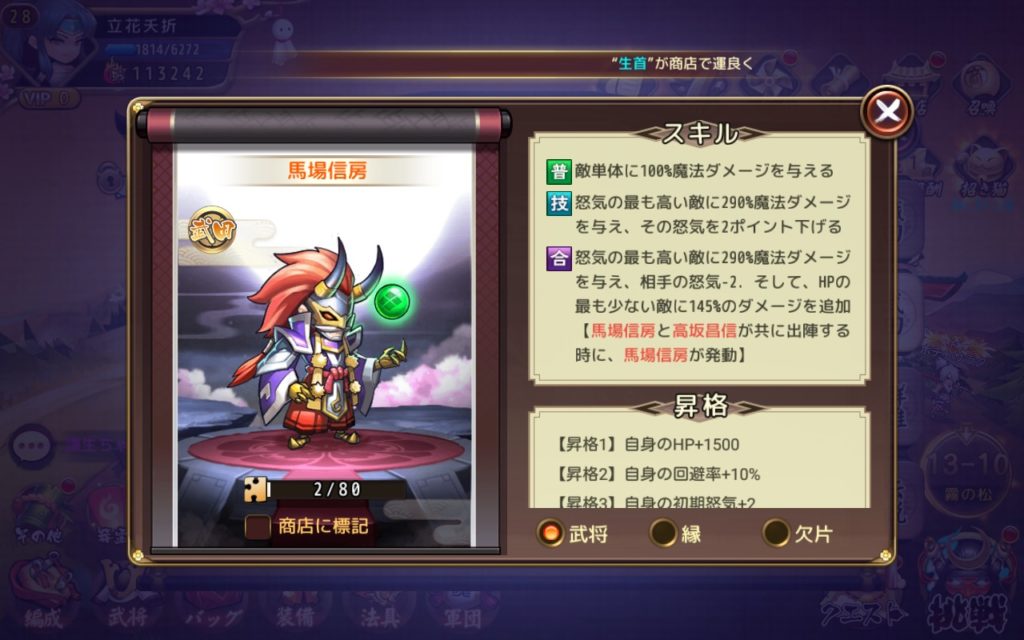 もしくは、武将欠片を神将商店で手にいれることができ、欠片を集めて、赤武将をゲットできます。