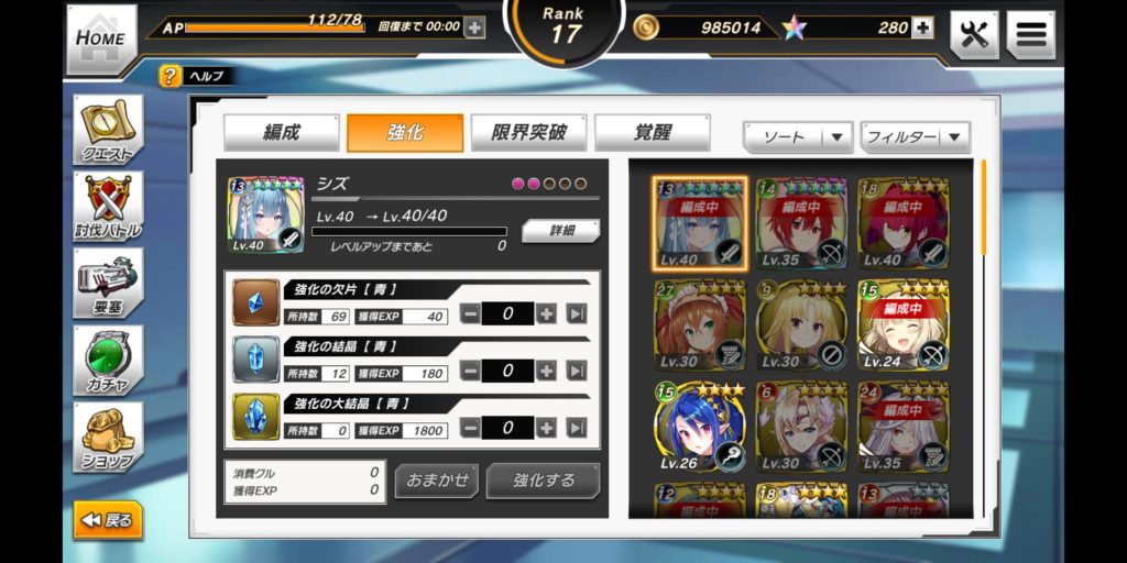 キャラのレベルを上げるには「強化の結晶」や「強化の欠片」などの専用アイテムを使用してレベルを上げていく必要があります。