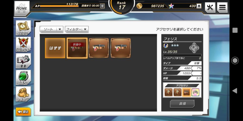 また、アクセサリは覚醒をフルでないと全ての装備ができなく、無課金であると「フェリス」のみとなります。