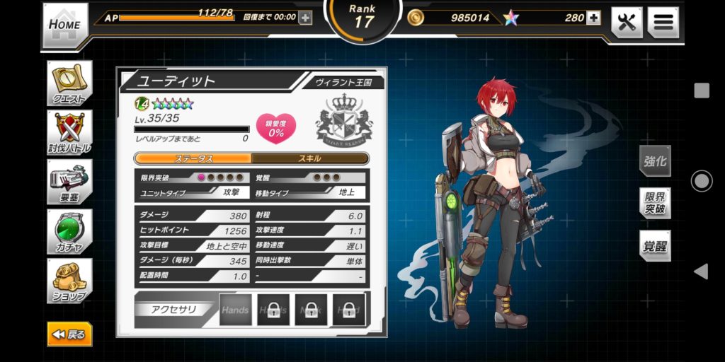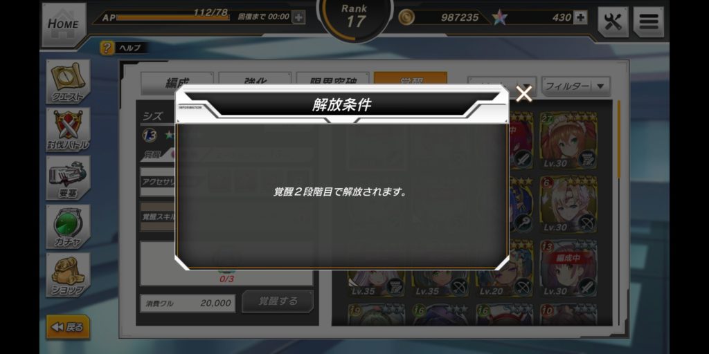 こちらもチュートリアルで入手でき、ストーリー報酬で全覚醒のアイテムを獲得できるので覚醒により開放する装備枠にダメUPの装備を付けることで無覚醒の最高レア以上の高火力も出すことが可能です。
