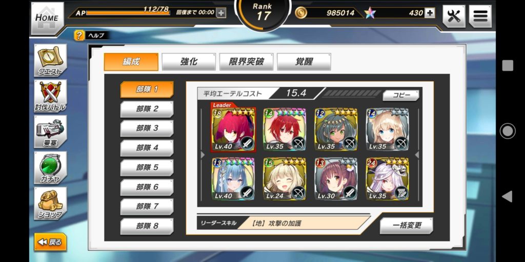 パーティは8人編成で「要塞」の項目などから編成ができます。