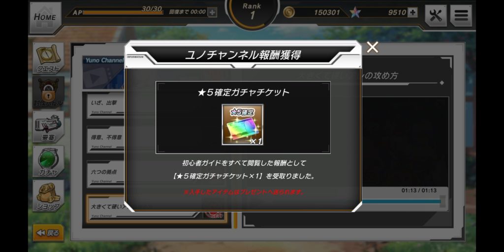 なので、1分くらいで★5の確定ガチャチケットを貰えます。