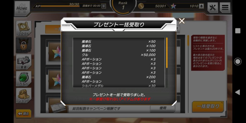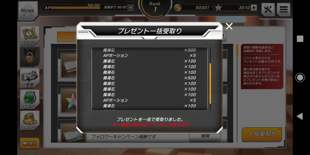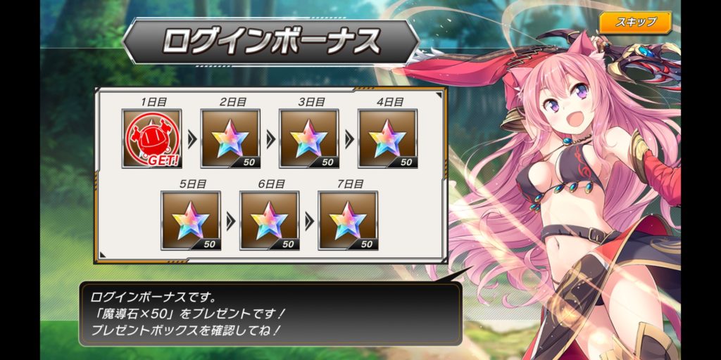 また、ログインボーナスや不具合のお詫びなども合わせればガチャに必要な「魔道石」が9500個ほど獲得することができます。
