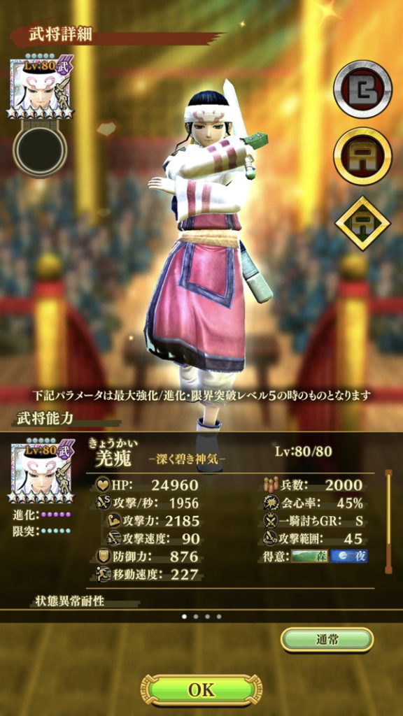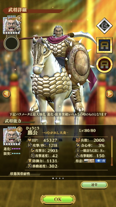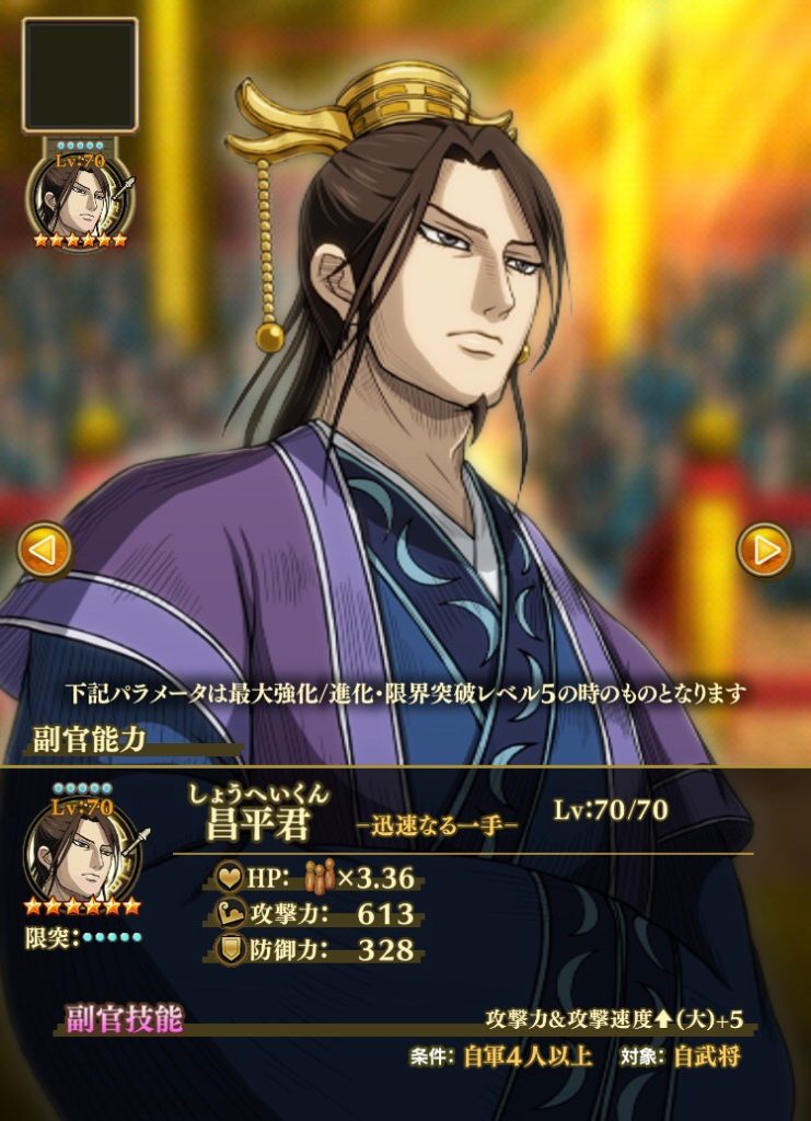 「副官技能」が必殺技の威力と攻撃速度アップになっています。攻撃速度アップの技能もちの大将・武将と組ませると異常なまでの高火力を実現してくれます。