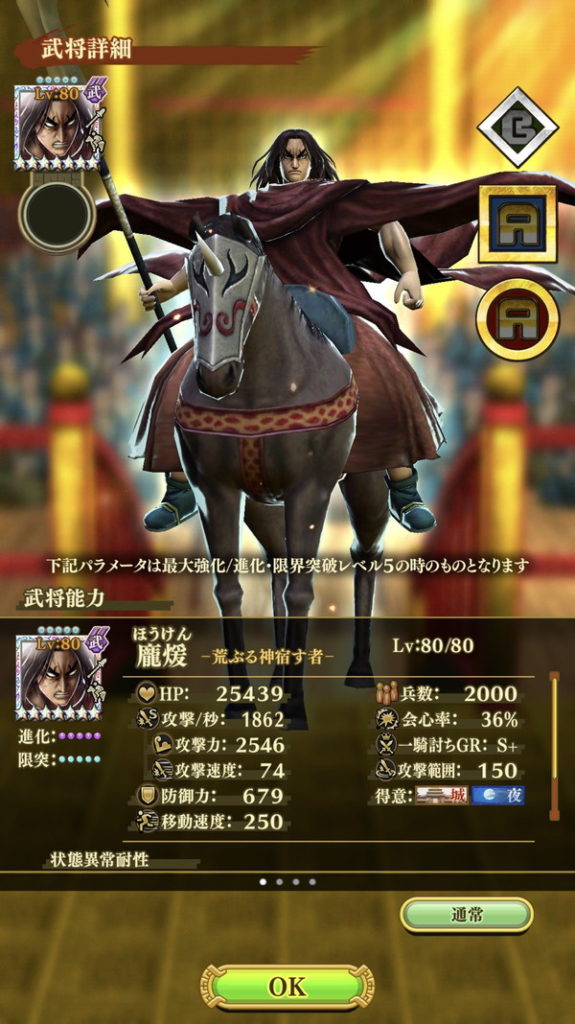 星7まで昇格させることが可能でステータスが非常に高いです。単独性能も驚異的に高く、「大将技能」「共闘技能」では、攻撃速度アップをもっているため大将・武将とどちらでも活躍させることができます。