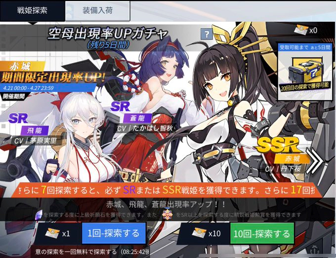 探索というのは、この「ブルーオース」の中では「キャラクターガチャ」のことになります。