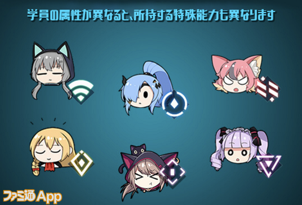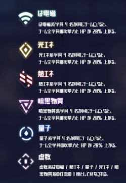 まず初めに、キャラクターには大きく分けで6つの属性に分かれていて、属性はそれぞれ「電磁」「光エネ」「熱エネ」「暗黒物質」「量子」「虚数」という名称になっています。