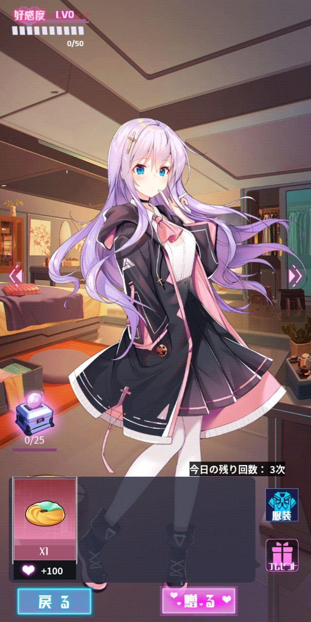 プレゼントは1日3回まで、あげることのできるプレゼントもエヴァンジェリンに「クッキー」が表示されているように、キャラクターごとに固定されているようです。