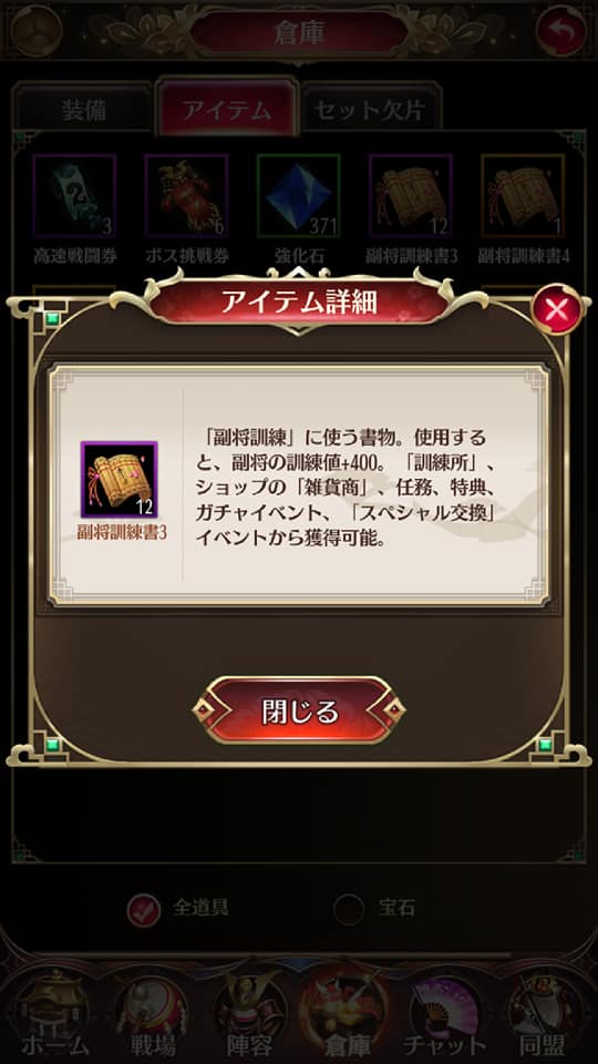 このアイテムは、副将のステータス値を上げるために使います。