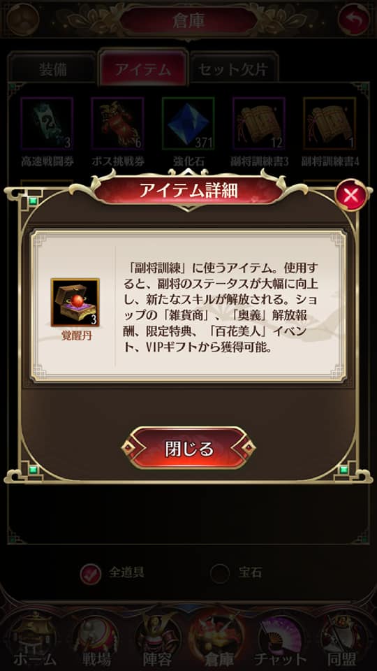「初級育成丹」、「高級育成丹」、「仙女育成丹の3種類あり、使う育成丹によって副将のステータスの上がる度合いが変わってきます。