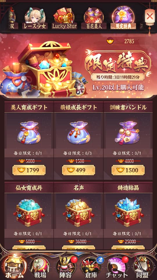 後、ガチャではないですが、「限定特典」に行くと元宝で育成丹を買うことも。