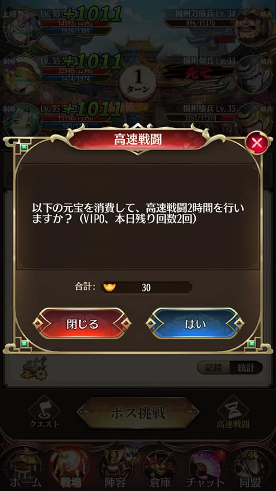元宝を30払うと2時間分の戦闘からの経験値を一気にもらえます