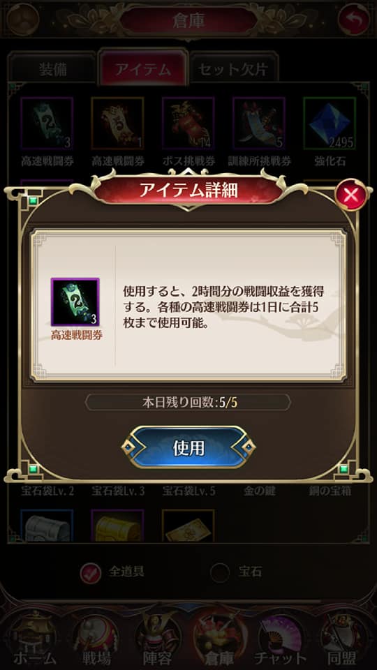 ログインや任務から入手できるアイテムでも高速戦闘が可能です。