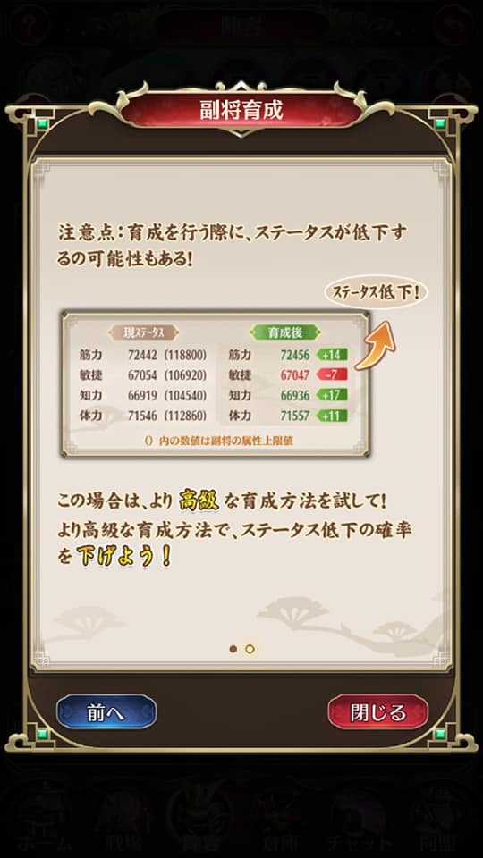 このように、強化した副将にレベルの低い育成丹を与えてしますと、ステータスが下がる可能性があります。