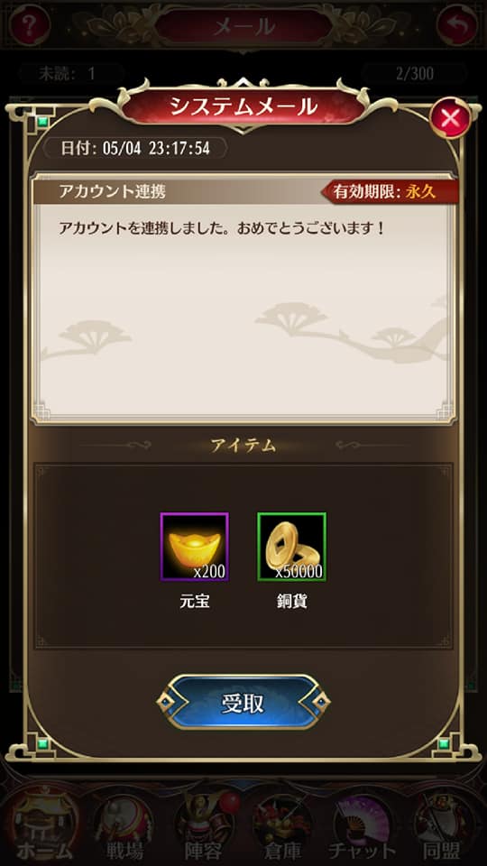 システムメールが届くので、確認後に受け取り可能です。