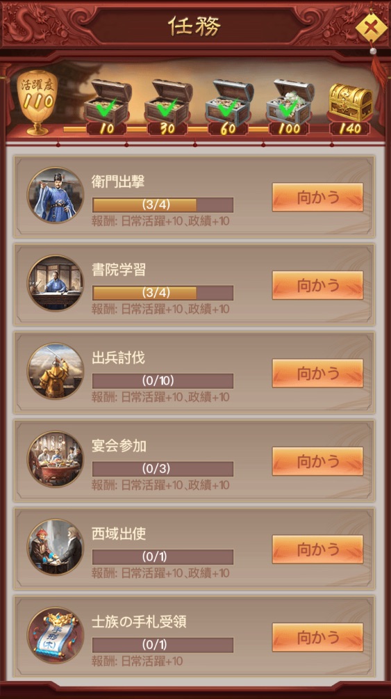 任務活躍度が140になると元宝50個を獲得することができます。(必ず獲得できるわけではありません。)