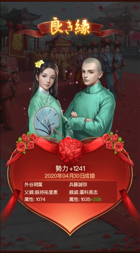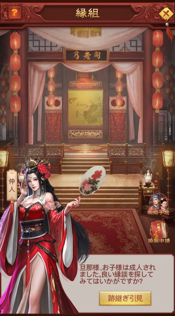 跡継ぎが成人すると他のプレイヤーの跡継ぎと結婚させることができます。