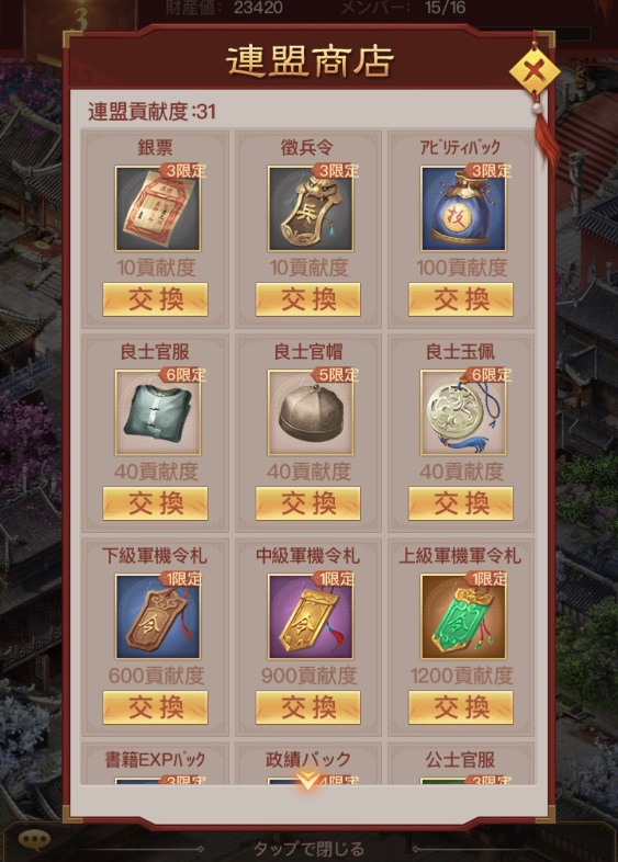 連盟商店では、連盟探検や毎日建設で獲得した『連盟貢献度』を使用して様々なアイテムと交換をすることが可能です。