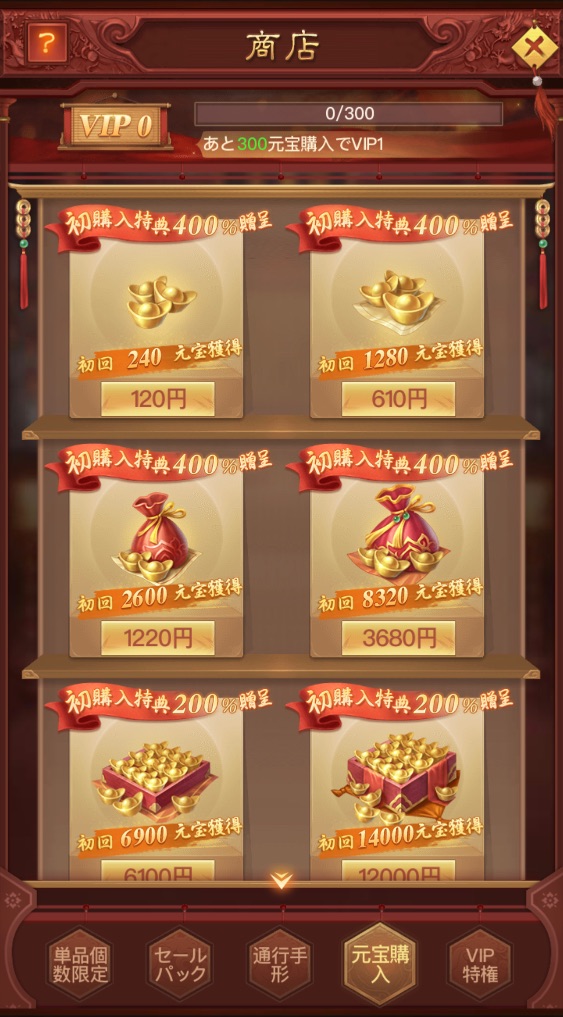 元宝だけの購入では、初回限定で初回購入特典がついていてお得となっています。
