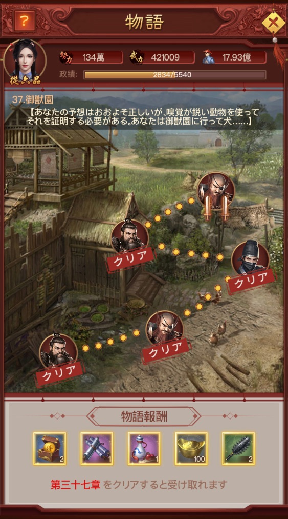 『物語』をクリアすると報酬で元宝を獲得することができます。