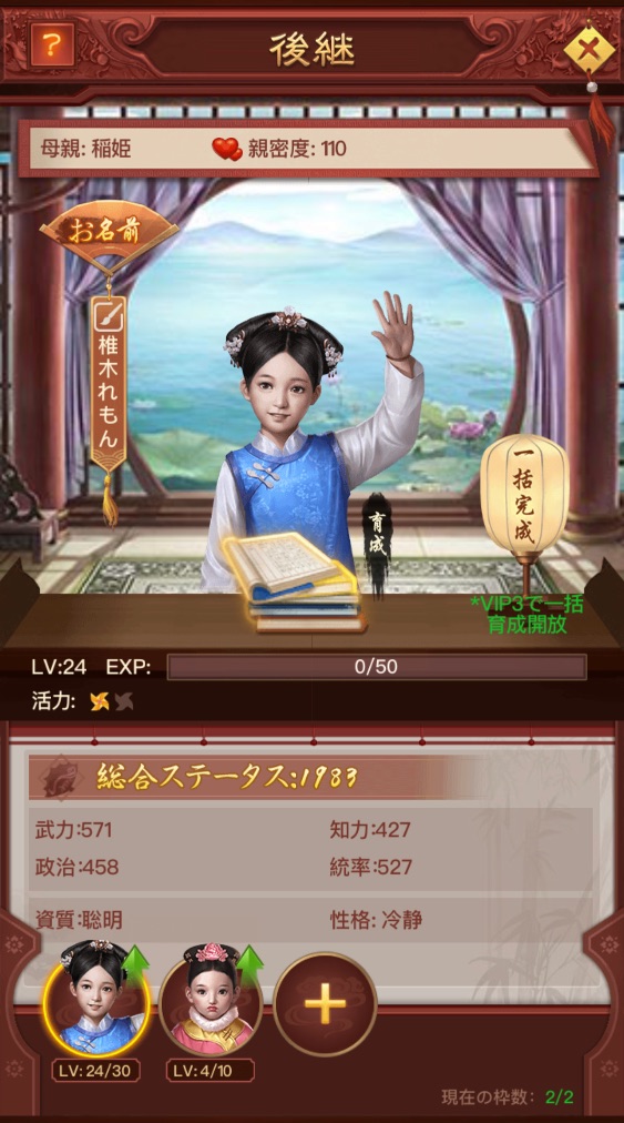 跡継ぎの能力は、母親(美女)の親密度が影響します。