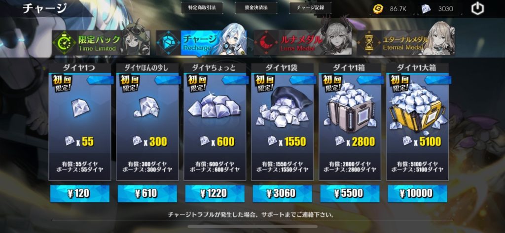 ダイヤは、ログインボーナスや様々な報酬で獲得ができる『無償ダイヤ』と、チャージ(課金)で獲得できる『有償ダイヤ』の2種類あります。