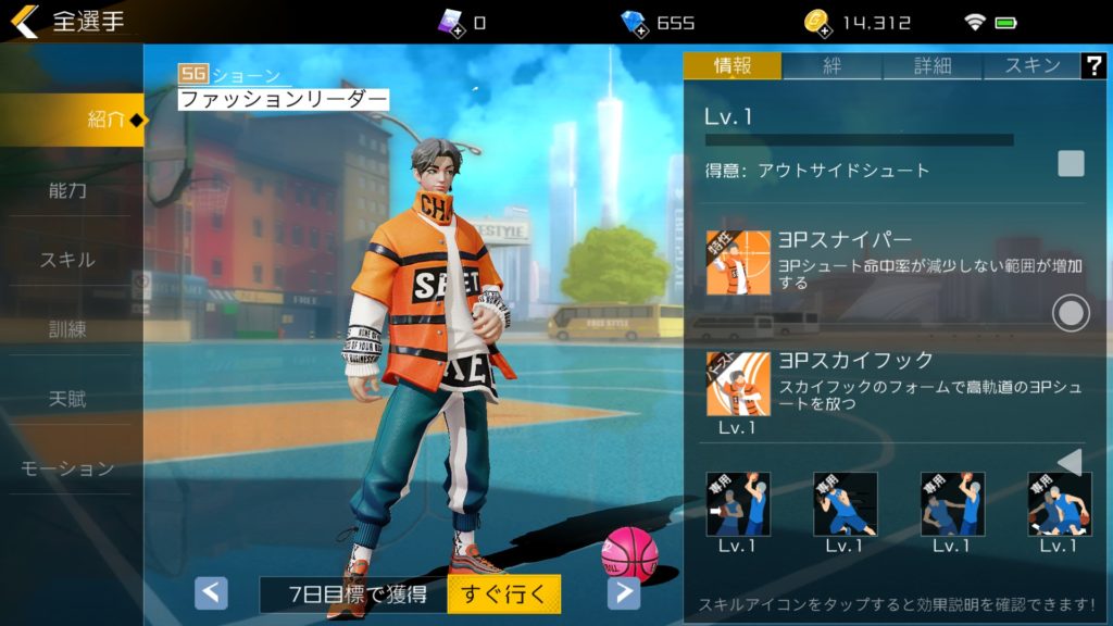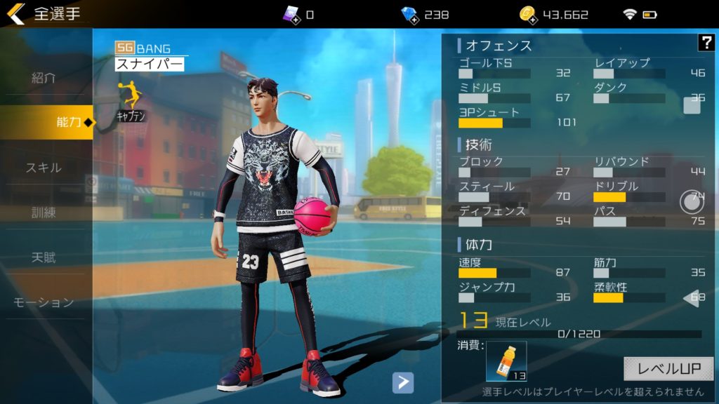 ミドルレンジからのシュート精度が高く、安定した得点をとることができるキャラクターです。