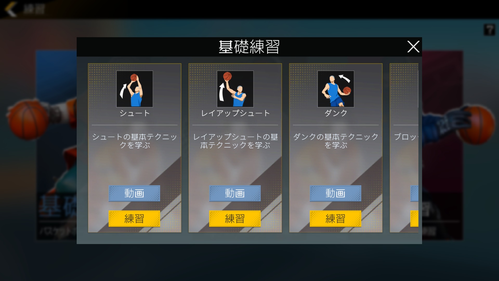 練習では「基礎」「共通」「選手」の3項目があり、この3つの練習をしておけば大体の基本操作を身に着けることができます。