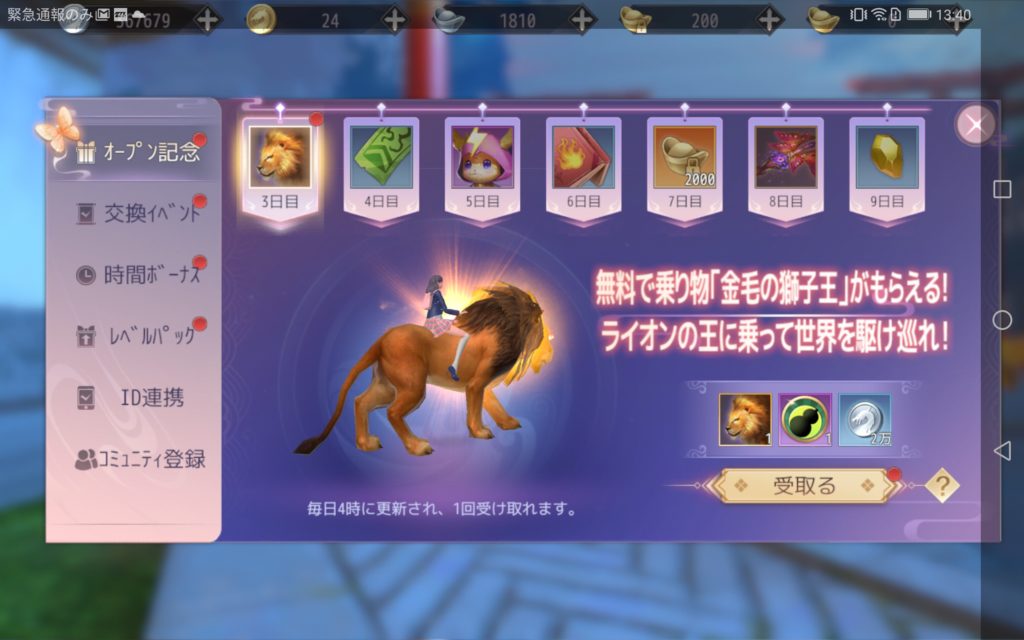 3日目のログインボーナスですが乗り物「金毛の獅子王」が貰えました。