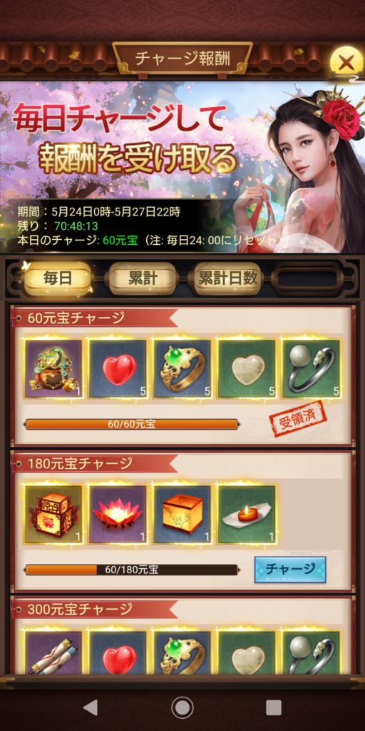 また、毎日チャージをするとそのチャージ分の元宝に応じて報酬も獲得することができます。