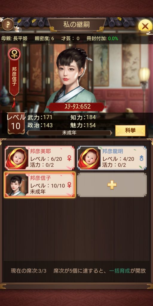 こちらは、美人との子供が産まれ最大レベルまで育成すると科挙行うことができます。