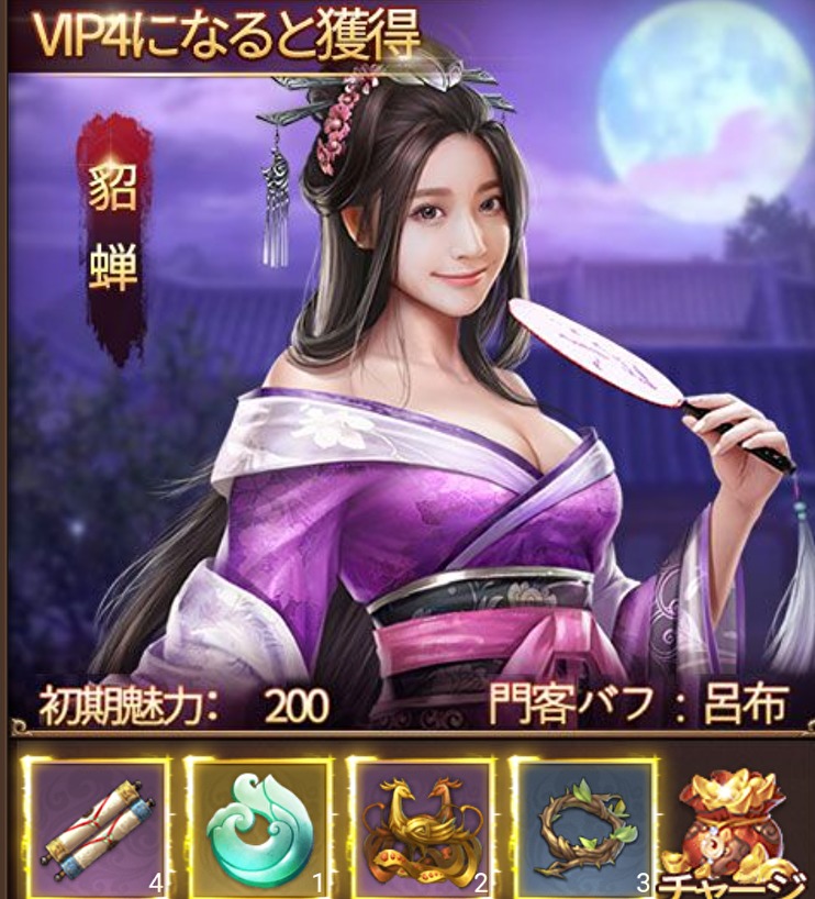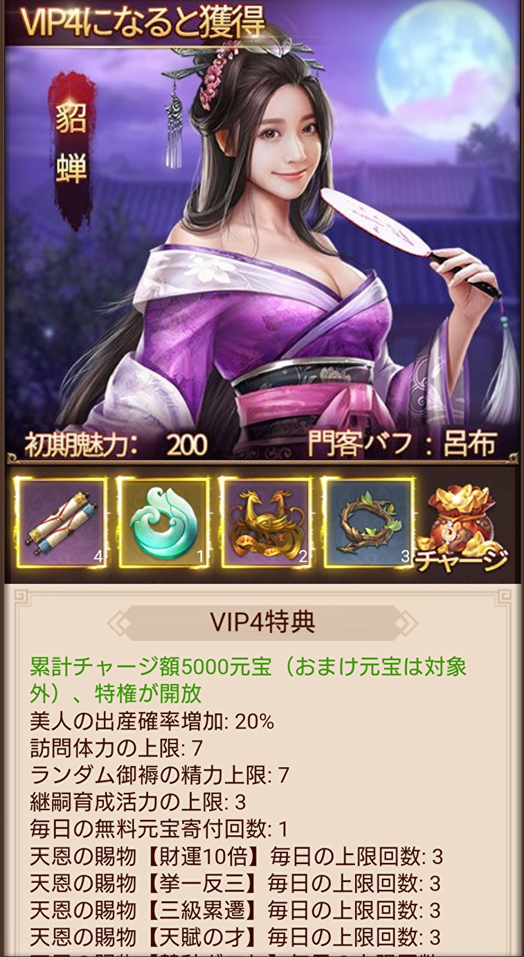 VIPレベル4で呂布に対応している美人「貂蝉」が獲得できるので最大課金額11800円分を課金すれば。一括でVIPレベル4、美人「貂蝉」と初回チャージ報酬の「呂布」が入手することができます。