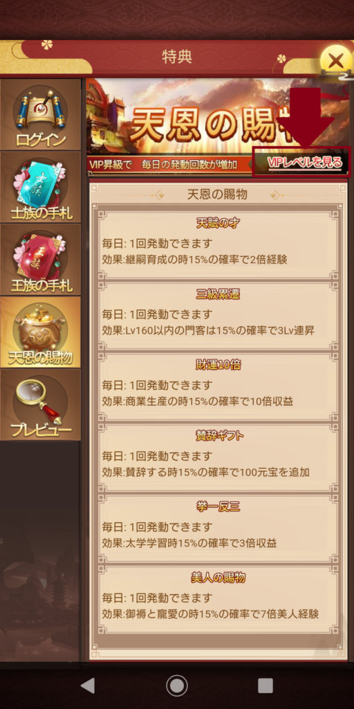 ボーナスについてはホーム画面の左上の「特典」から「天恩の賜物」をタップして右上辺りに「VIPレベルを見る」で確認をすることができます。