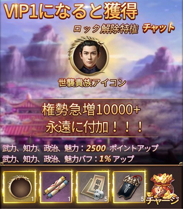 VIP1では権勢を10000+できるアイコンや武力などのステータスのバフ1%アップと各2,500ポイントアップなどあります。
