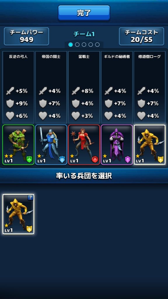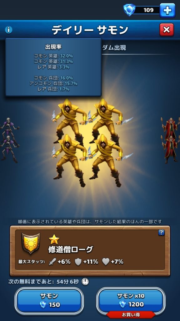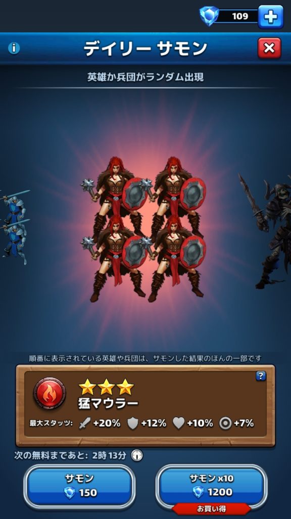 序盤は毎日の無料ガチャなどで兵団が出てくるとガッカリするかもしれませんが、後々役に立つので安心してください。
