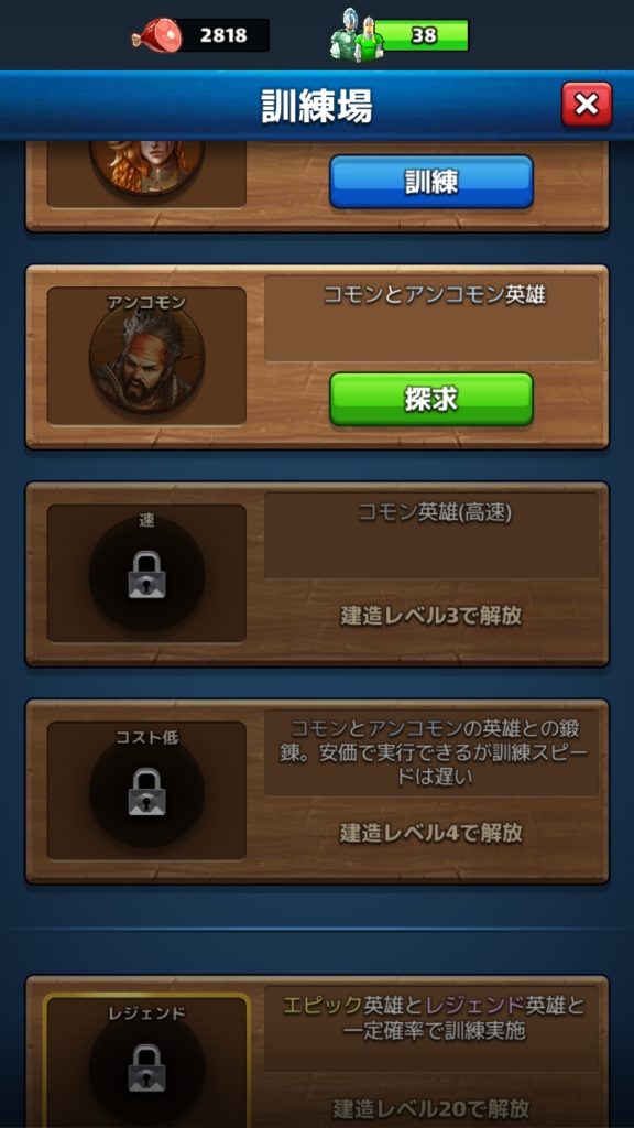 エピックとレジェンドの英雄も訓練で入手可能ですので、コツコツと訓練場のレベルを上げていきましょう。