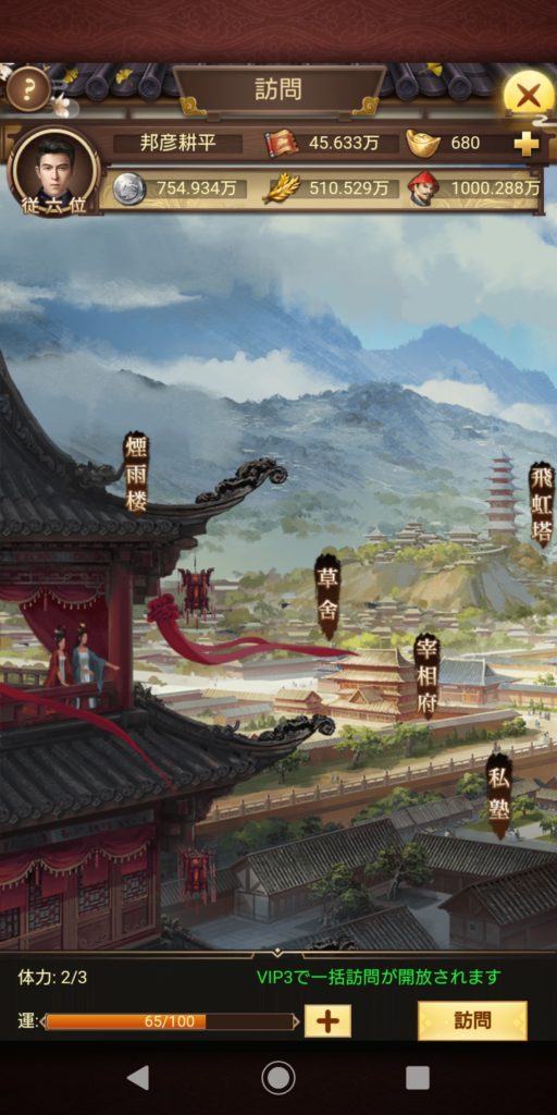 ただ、あまり訪問をやりすぎると運も下がっていき、運が60台になってくると全く美人に会えず、銀両なども貰えないことも発生してくるので運は60以上を維持しながら訪問をすることが良いです。