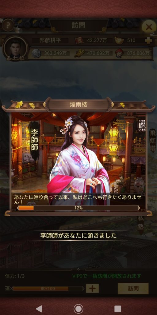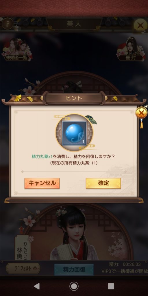 とはいっても、「寵愛」のように元宝を使用することもなく、精力を消費して最大3回まで連続で行えるので美人が少ないうちは特に問題はないでしょう!