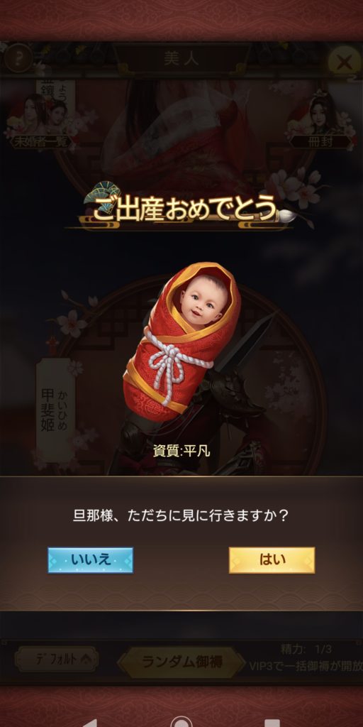 もちろん、「ランダム御褥」でも美人経験値と子供を低確率で授かることも可能ですが、こちらは完全にランダムとなっており育成したい美人に必ず御褥するわけではないので注意です。