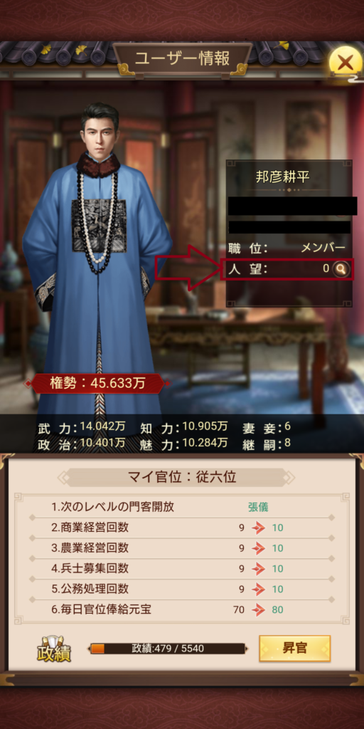 人望については、ユーザー情報の職位の下に人望があり虫眼鏡マークをタップすることで詳細が記載されているの一度確認しても良いです。
